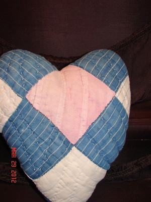 Title (ebay affiliate link): Primitive Handmade heart pillow~patchwork vintage quilt, blues, pinks, creams