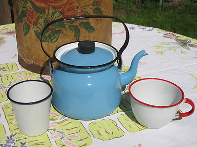 Title (ebay affiliate link): Country French Blue enamelware teapot including coffee cup & tumbler NR