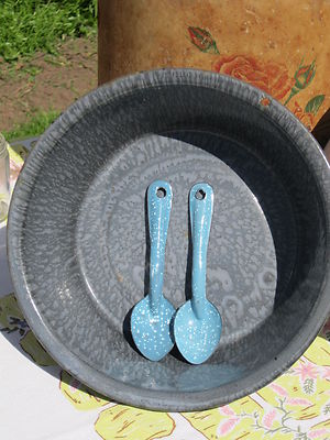Title (ebay affiliate link): Gray speckled (graniteware?) bowl & white enamelware bowl including 2 spoons NR
