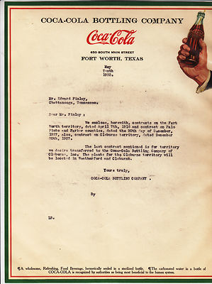 COCA-COLA BOTTLING COMPANY LETTERHEAD FORT WORTH TEXAS HAND HOLDING BOTTLE