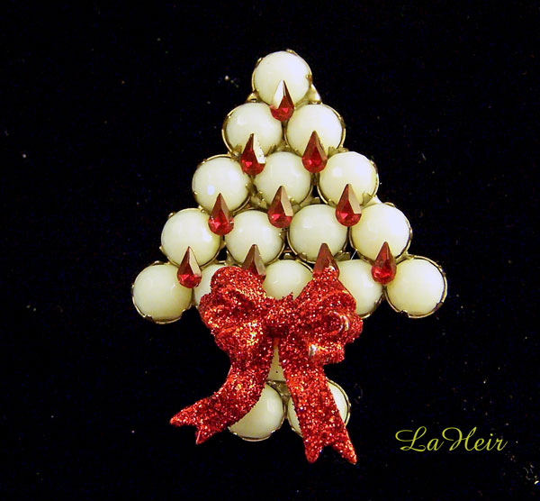 LaHeir Christmas Tree Pin:Vintage Milk Glass Rhinestone