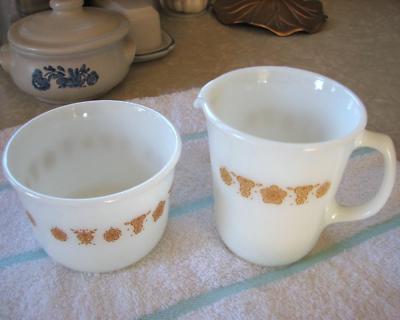 Title (ebay affiliate link): Milk Glass PYREX BUTTERFLY GOLD Creamer Sugar Set MINT!