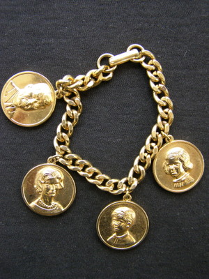 Title (ebay affiliate link): VINTAGE Gold Tone John F KENNEDY Family Charm Bracelet JACKIE CAROLINE JOHN JR
