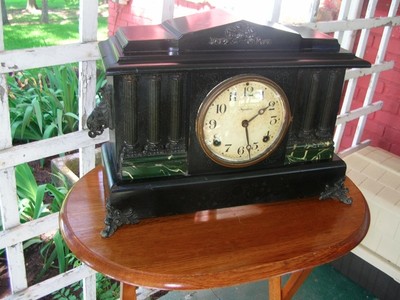 Title (ebay affiliate link): Antique Ingraham Clock Company Enameled Wood with Pillars Black Mantel Clock