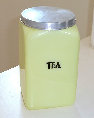 Title (ebay affiliate link): McKee Seville Yellow 48 Oz Press on Lid Pop Top TEA Canister Storage Jar