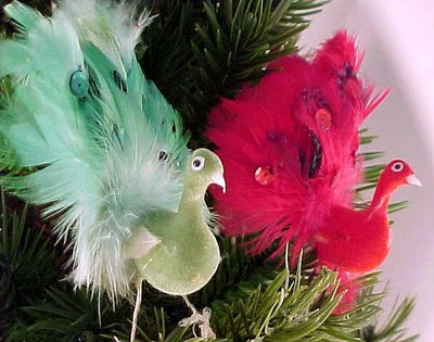 Title (ebay affiliate link): Vintage Flocked Feathered Peacock Birds Christmas Ornaments With Wired Feet
