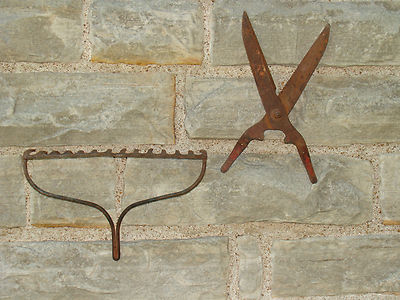 Primitive steel rake head, vintage garden and lawn tool and sheers