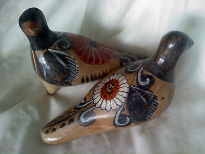 TWO VINTAGE CLAY / CERAMIC BIRDS ~ HAND PAINTED ~