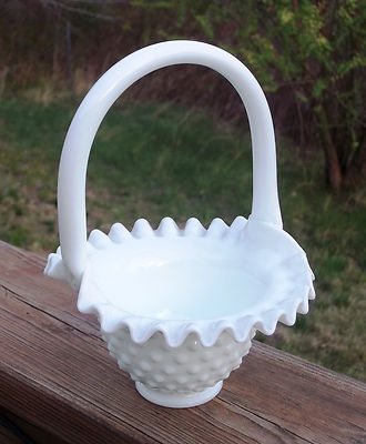 Title (ebay affiliate link): Elegant Fenton Milk Glass Hobnail Pattern 6 1/2 Inch Crimped Rim Handled Basket