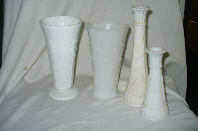4 DIFFERENT MILK GLASS VASES