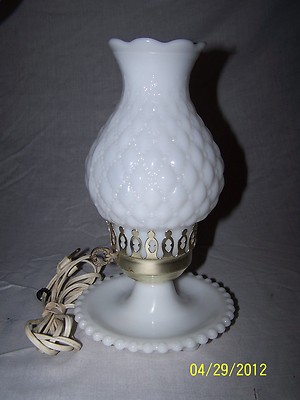 WHITE HOBNAIL MILK GLASS VINTAGE HURRICANE LAMP & CHIMNEY