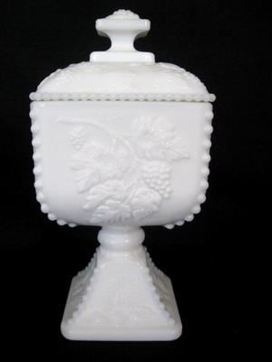 IMPERIAL GLASS COVERED FOOTED CANDY DISH WHITE MILK GLASS GRAPE PATTERN COMPOTE