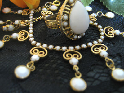 Title (ebay affiliate link): Milk Glass Rhinestone cut Dangling Harem Bracelet Dome Cocktail Ring Vintage Lot