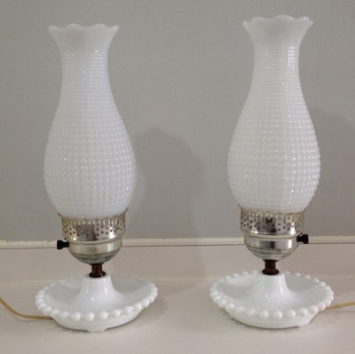 Title (ebay affiliate link): VINTAGE HOBNAIL MILK GLASS 2 VINTAGE HURRICANE VANITY TABLE LAMP
