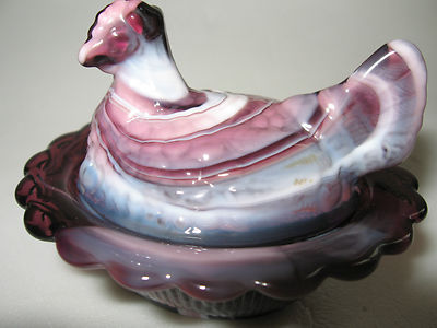 Amethyst and milk slag glass salt cellar hen chicken on nest basket dish purple