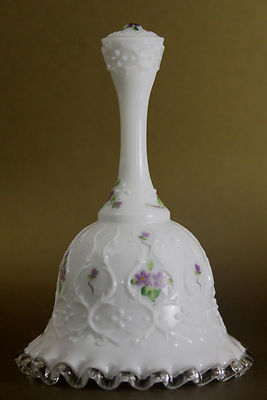 Title (ebay affiliate link): VINTAGE FENTON MILK GLASS BELL HAND PAINTED VIOLETS ON SPANISH LACE SIGNED CREST