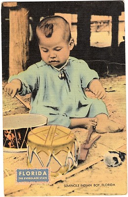 Title (ebay affiliate link): Seminole Indian Small Boy Drums Florida Native American Linen Postcard