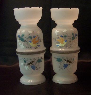 Title (ebay affiliate link): PAIR OF MATCHING MIRROR IMAGE BRIISTOL VASES - ENAMELED BIRDS AND FLOWERS