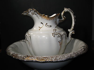 Title (ebay affiliate link): Beautiful Antique White & Gold JOHNSON BROS Pitcher & Basin Bowl set c1913