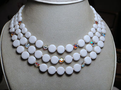 Title (ebay affiliate link): Vtg WEST GERMANY 3 Strand WHITE Milkglass & AB CRYSTAL Necklace