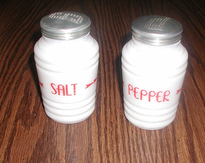 Title (ebay affiliate link): VINTAGE MILK GLASS KITCHEN RANGE SALT PEPPER RED LETTERS/DESIGN SHAKERS TIN LIDS