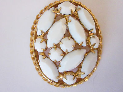 Title (ebay affiliate link): 1 7/8" VINTAGE BROOCH GOLD FILIGREE WHITE MILK GLASS CAMEO SUMMER FANCY SCROLL