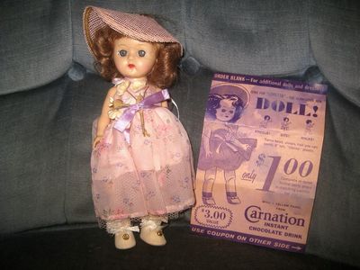 Title (ebay affiliate link): 1958 Loretta Carnation Chocollate Drink Advertising 8" Doll in Box w/Coupon