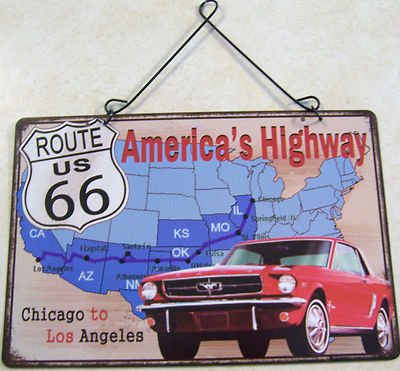 Title (ebay affiliate link): ROUTE 66 America's Highway Chicago to Los Angeles W/ Red 65 Mustang /Metal sign