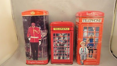 Title (ebay affiliate link): Vintage Collection Of 3 Candy Tins English Telephone Kiosks Money Boxes