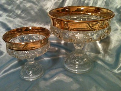 Title (ebay affiliate link): Large Glass Compote 7.25" tall & Small Glass Compote 5.25" tall w/ GOLD Inlay
