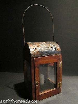 Replica Antique Primitive Wood Lantern Pierced Punched Tin Roof