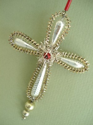 Title (ebay affiliate link): Vintage BOHEMIAN glass beaded Christmas ornament Tinsel wrapped wire CROSS