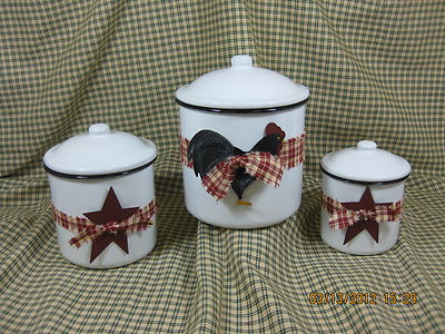 Title (ebay affiliate link): White enamelware Canister Set of Three Primitive or Rustic Decor