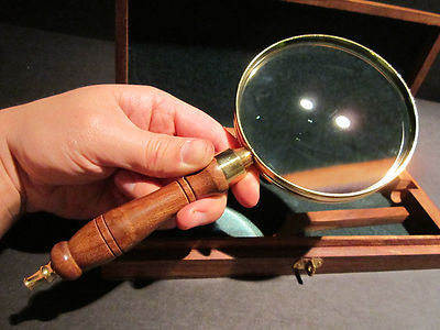 Title (ebay affiliate link): Replica 19th C Antique Wood Box Brass Turned Magnifying Glass Hand Lens Desktop