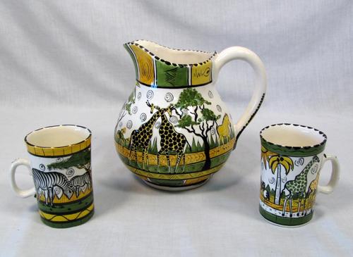 PENZO ZIMBABWE HAND PAINTED 8" WATER PITCHER & 2 MUGS SET