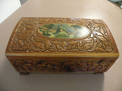 Title (ebay affiliate link): Vintage Carved Cedar Box w/ Mirror on inside and Scenic Image on top