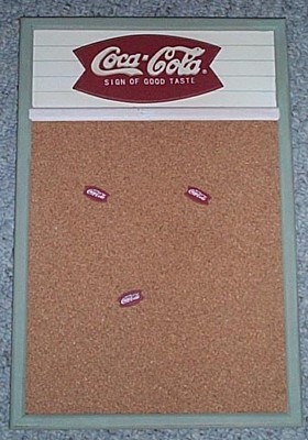 Title (ebay affiliate link): COCA COLA WOODEN FISHTAIL LOGO CORK MEMO BOARD W/ PINS NEVER USED