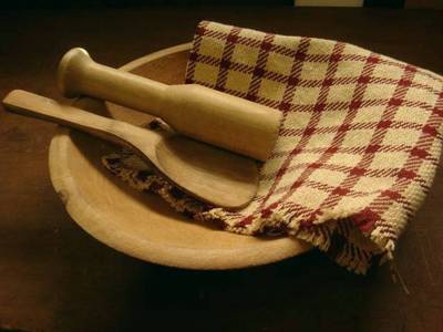 Title (ebay affiliate link): PRiMiTiVe~Old Wood BOWL GATHERING~Spoon~Masher~Red/Tan Check Coverlet Piece~PSAH