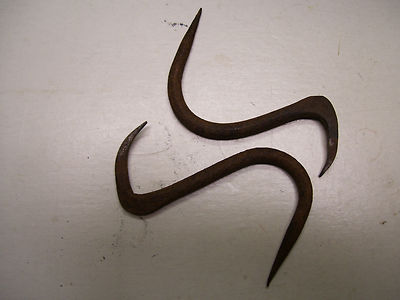 ANTIQUE HAND FORGED IRON MEAT HOOKS BARN HAMMER ANIMAL YARD COW PIG DEER HANGING