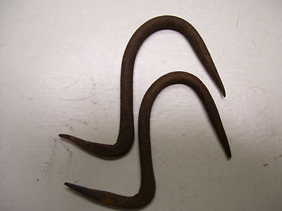 ANTIQUE HAND FORGED IRON MEAT HOOKS BARN HAMMER ANIMAL YARD COW PIG DEER HANGING
