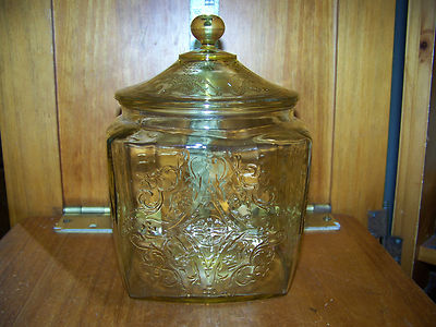 Title (ebay affiliate link): VINTAGE HOCKING YELLOW DEPRESSION GLASS BISCUIT COOKIE STORAGE JAR WITH LID NICE