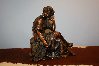 VINTAGE ART NOUVEAU BRONZE METAL LADY SITTING THINKING WITH HARP