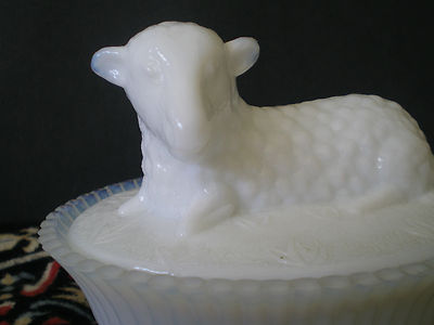 Title (ebay affiliate link): ANTIQUE MILK GLASS COVERED DISH W/ FIGURAL SHEEP/LAMB ON LID