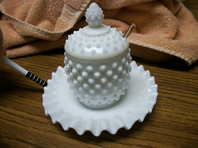 Title (ebay affiliate link): Fenton milk glass hobnail 4 Piece Jam Set #3908 1953-73 Pre-Logo look