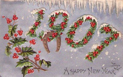 Title (ebay affiliate link): VINTAGE NEW YEAR POSTCARD LARGE LETTER DATED 1907 HOLLY & HORSESHOE