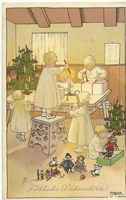 Title (ebay affiliate link): 4987 ART SIGNED PAULI EBNER CHILDREN WITH CHRISTMAS GIF CIRCULATED 1913 POSTCARD