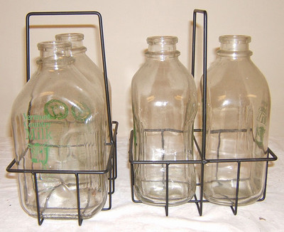 4 Old milk bottles w wire holders hf gal Vermont NR lot