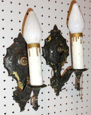 Title (ebay affiliate link): ANTIQUE Pair Solid Brass WALL SCONCES c 1915-20 Electric CANDLE FIXTURES