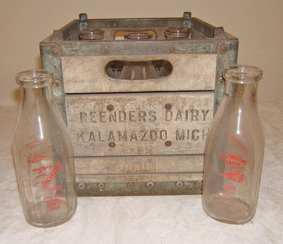 5 Old dairy milk bottles Chickagami qt w wooden crate NR lot