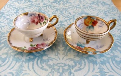 2 Vintage Demitasse Footed Cups & Saucers Hand Painted